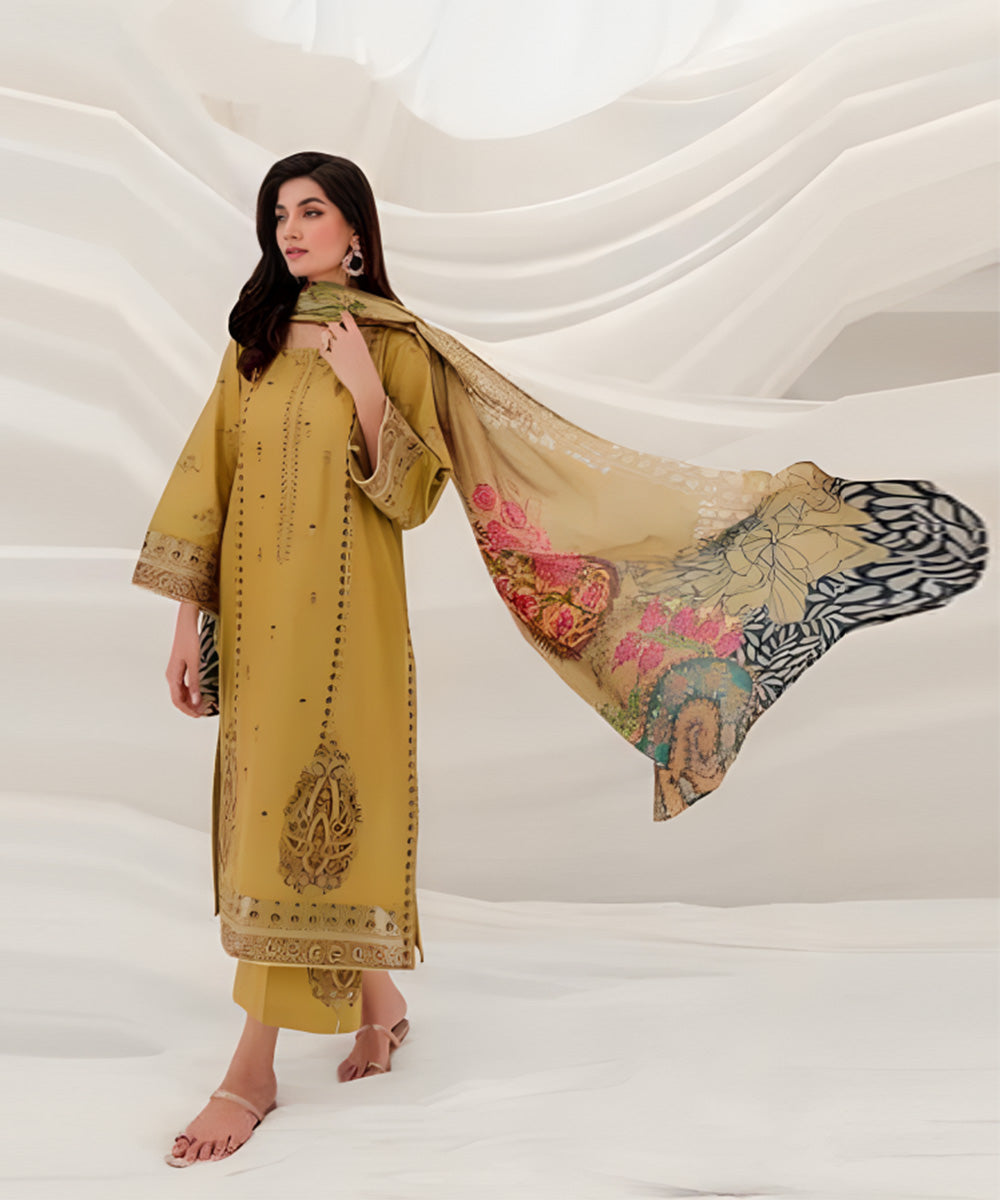 Dhanak Front Embroidered Dhanak Sleeves Embroidered Digital Printed Pashmina Shawl Dhanak Embroidered Trouser Dhanak Plain Dyed Back