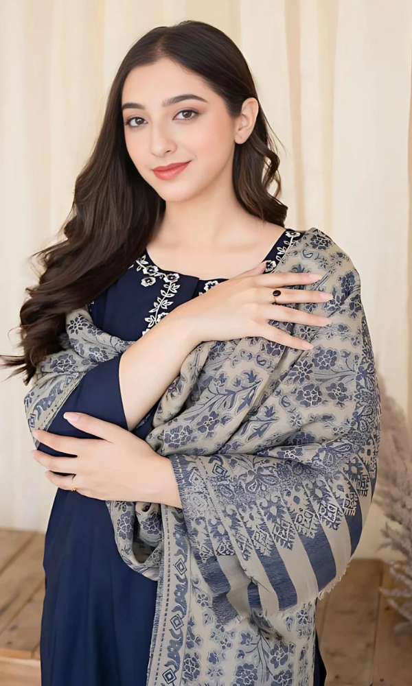 Aisling AS-623 premium 3-piece winter dhanak embroidered suit with embroidered shirt, embroidered sleeves, dyed plain back, plain trouser, and digital printed pashmina wool shawl.