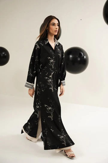 This printed dress made in shamoz silk fabric has a two piece collar with placket and pleat detail along the front, a back yoke, batwing sleeves with printed cuffs, side slits and an A-hem. Shirt length is 52". Model is wearing size S. Model height is 5'6. Color may slightly vary from the images.