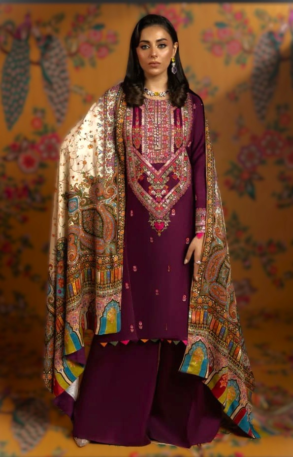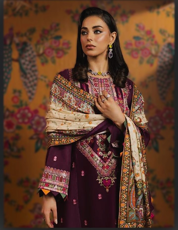 Step into elegance this winter with Faiza Faisal’s Luxury Dhanak Collection. This stunning 3-piece suit is crafted from premium Dhanak fabric, adorned with heavy embroidery on the front and sleeves, and paired with a vibrant digital printed wool shawl. The plain dyed trouser completes the sophisticated look, making it perfect for festive and formal gatherings.