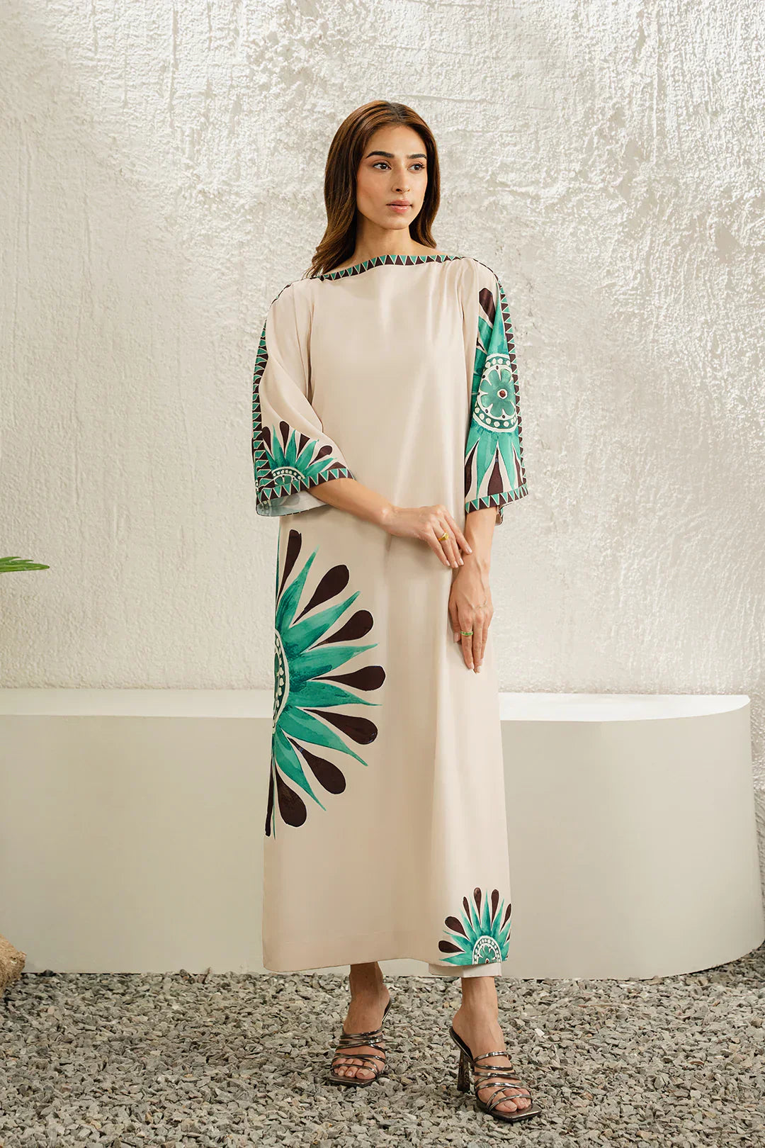 This top, made in Shamoz Silk fabric, in floral print, features boat neckline with batwing sleeves, side slits and straight hem.