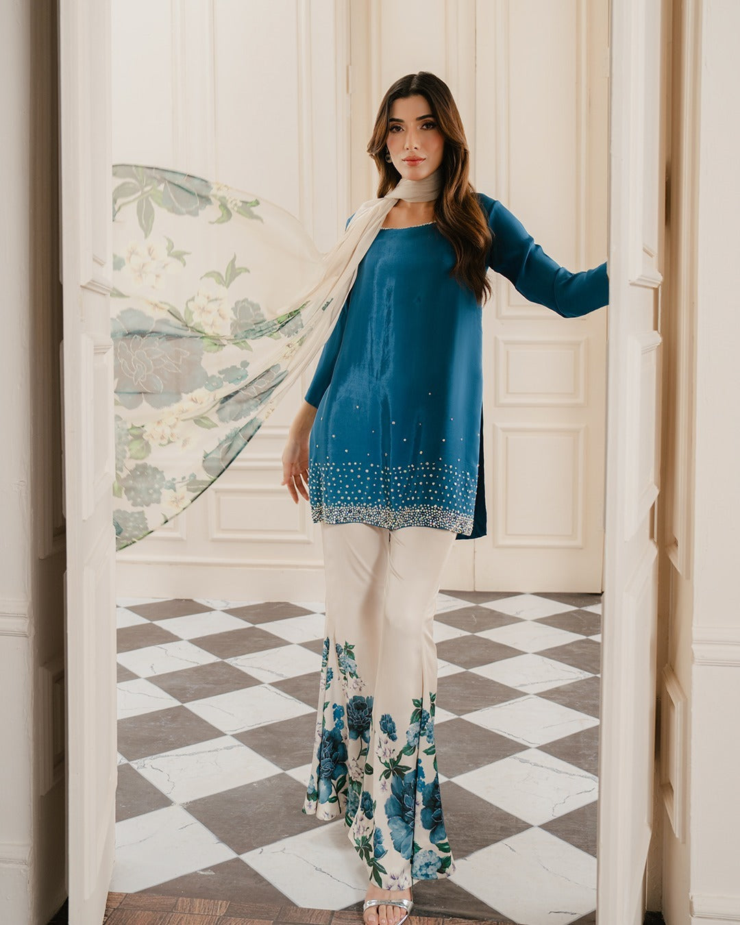 This top, made in shamoz silk fabric, features square neckline with spaghetti straps, adorned with crystal embellished spray along the bottom hem, side slits & straight hem.