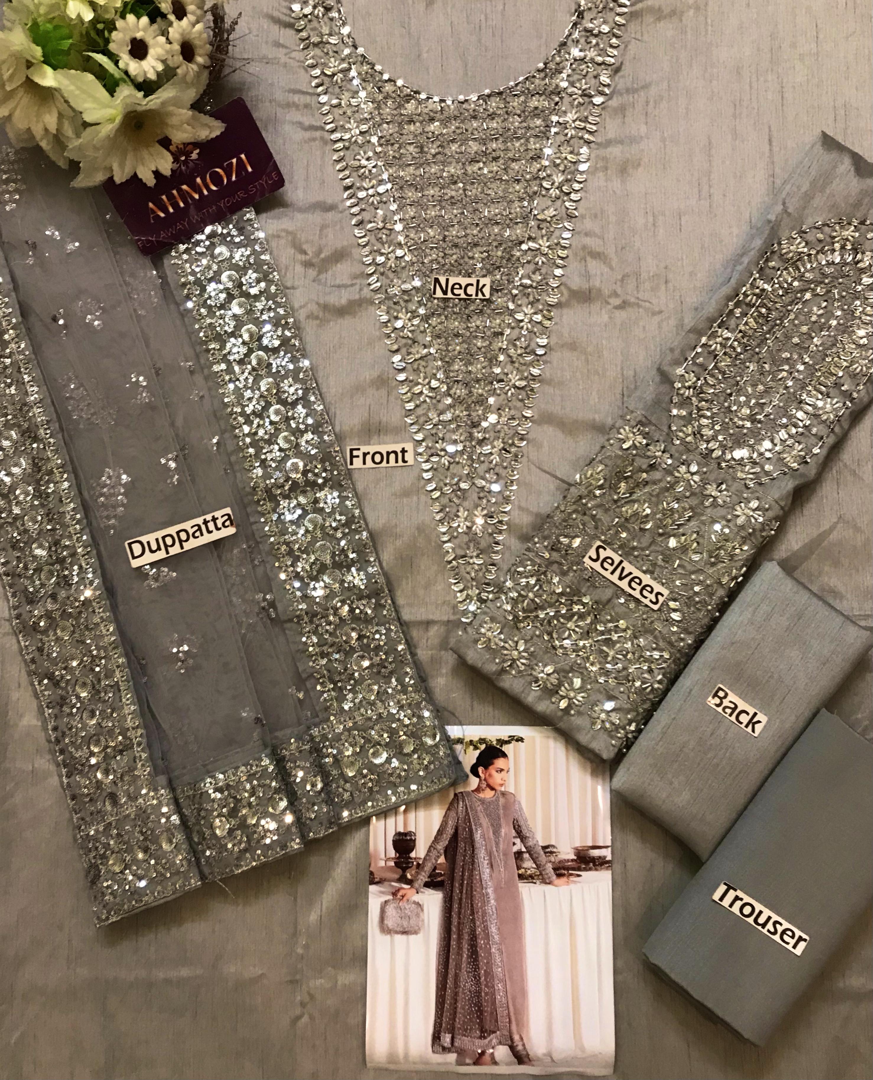 Experience pure elegance with this Hussain Rehar inspired luxury raw silk 3-piece suit, crafted with exquisite handwork and premium detailing. Perfect for weddings, formal evenings, and festive events. Fabric Details: