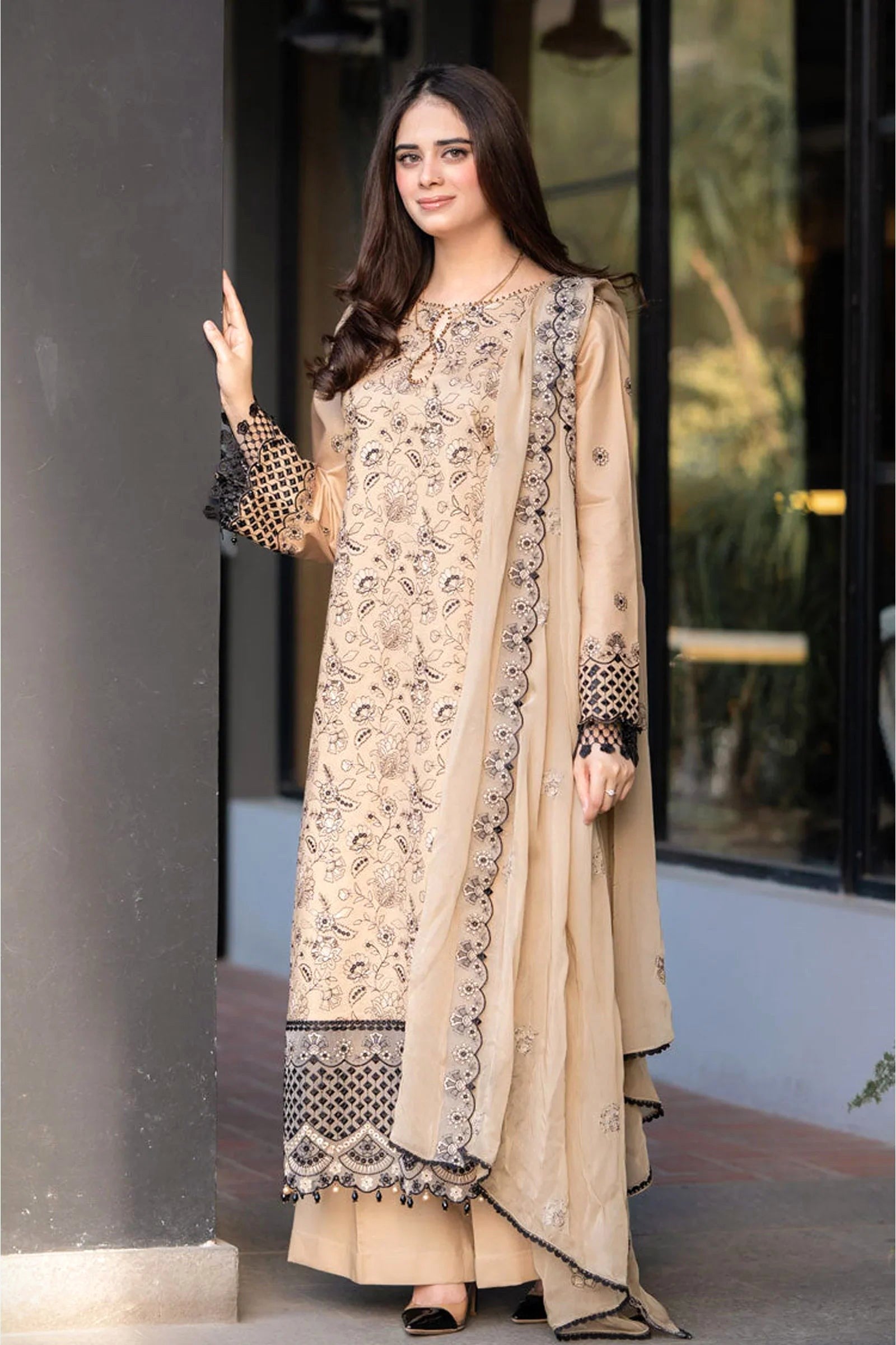 Elevate your winter wardrobe with this elegant luxury Dhanak 3-piece suit, beautifully crafted with fine embroidery. The delicately embroidered front and sleeves are paired with a graceful organza daman patch, adding a premium festive touch. Finished with a soft chiffon embroidered dupatta and a plain...