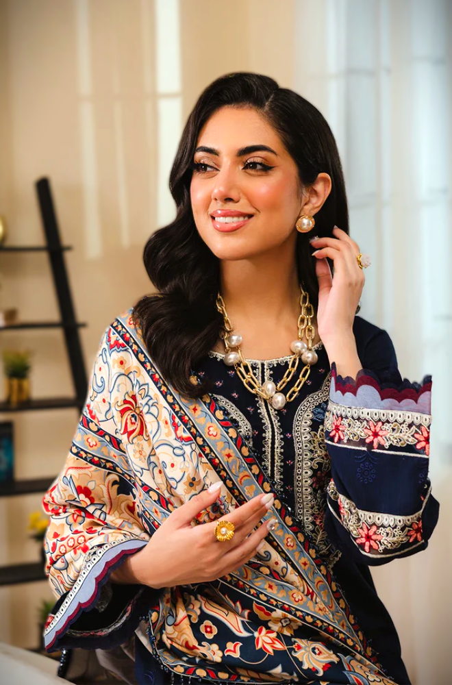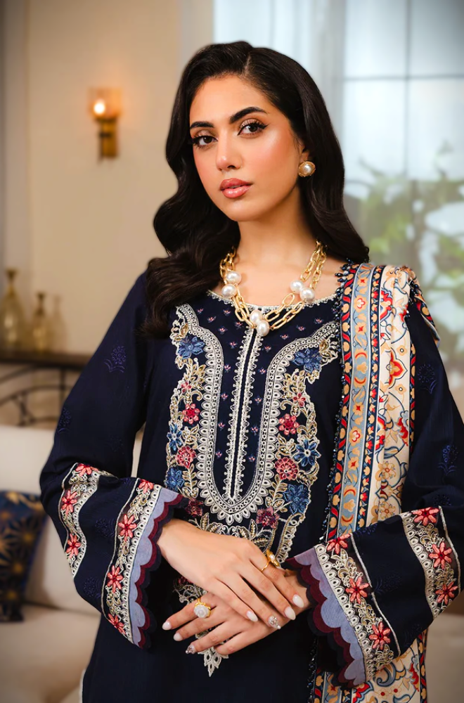 Elevate your winter wardrobe with this luxurious Mahnur Embroidered Dhanak 3PC Suit. The deep navy blue embroidered Dhanak shirt is beautifully detailed with intricate embroidered patches and elegant sleeves. Paired with a printed wool shawl featuring rich traditional motifs and a plain dyed trouser, this...