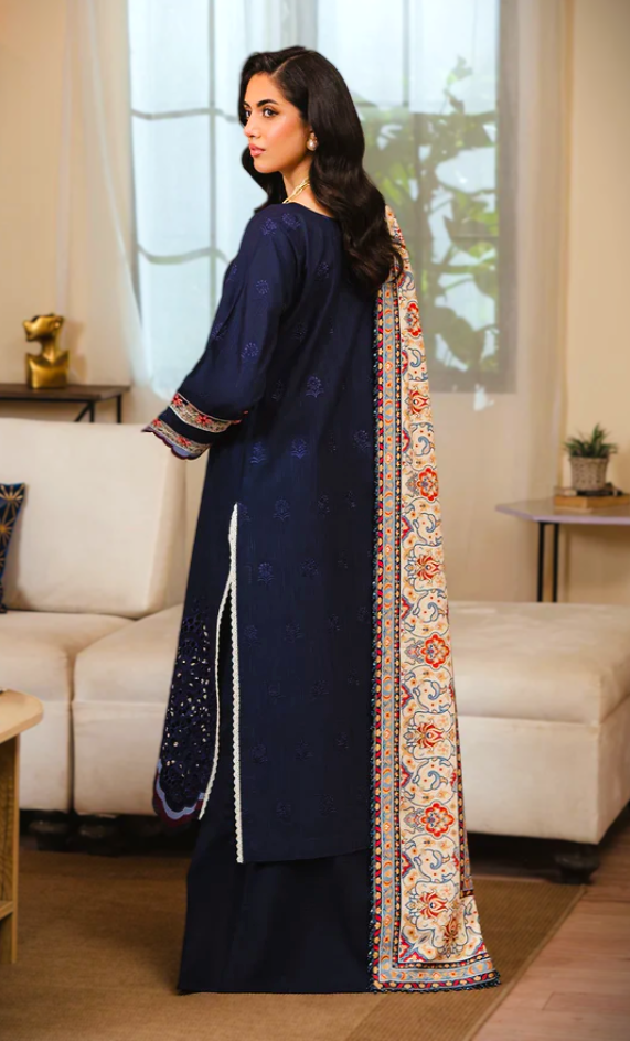Elevate your winter wardrobe with this luxurious Mahnur Embroidered Dhanak 3PC Suit. The deep navy blue embroidered Dhanak shirt is beautifully detailed with intricate embroidered patches and elegant sleeves. Paired with a printed wool shawl featuring rich traditional motifs and a plain dyed trouser, this outfit perfectly blends comfort and sophistication. Ideal for formal gatherings or festive occasions, this ensemble reflects timeless elegance and fine craftsmanship.