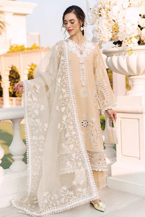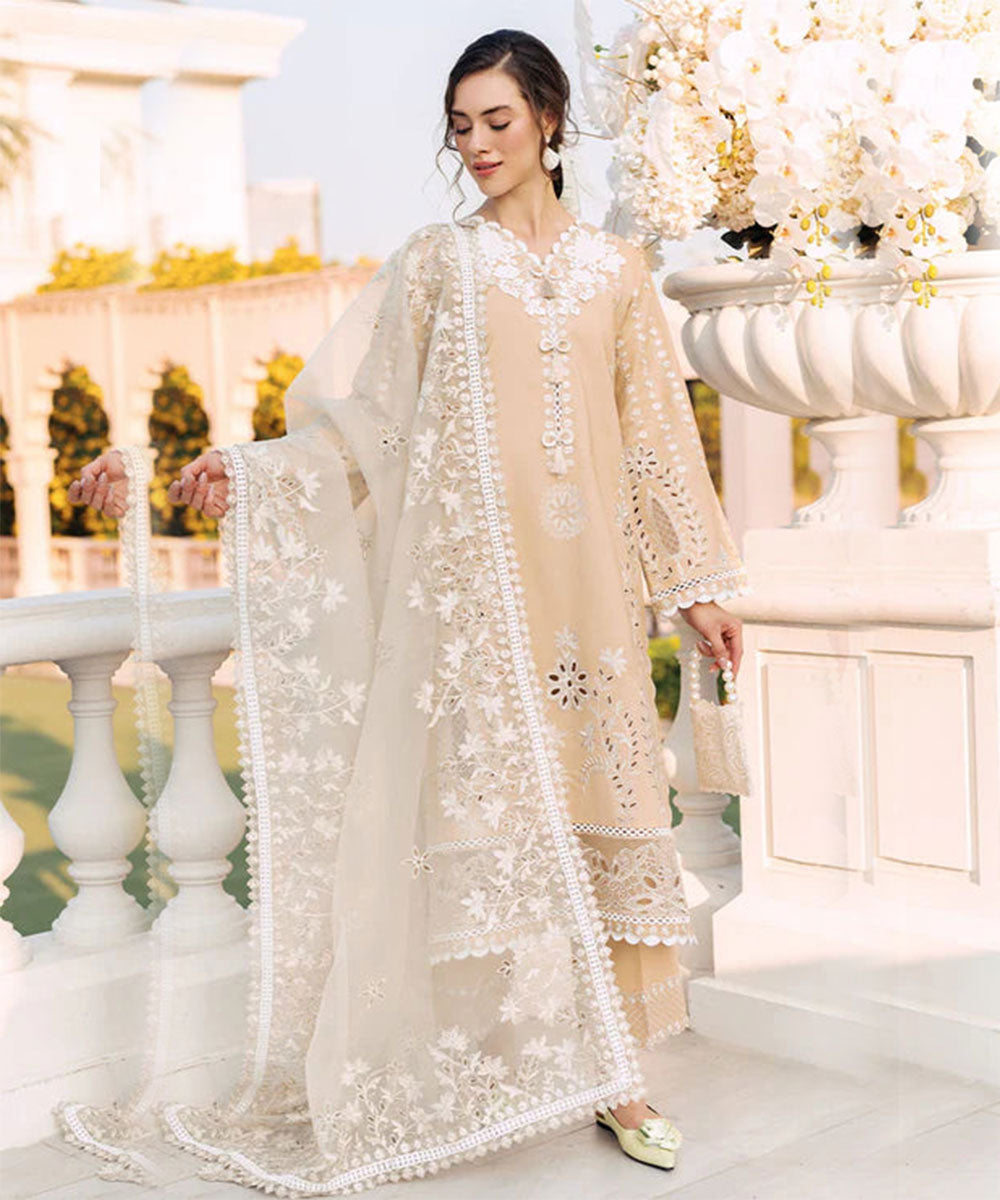 ShirtEmbroidered Lawn Chikenkari Front with daman patchEmbroidered Lawn Chikenkari SleeveOrganza Embroidered Daman PatchDupattaEmbroidered Organza Dupatta TrouserDyed Lawn trouser