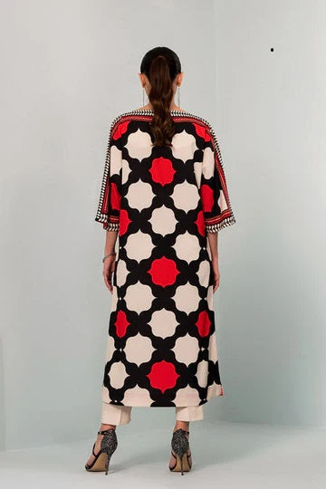 • This top made in soft crepe fabric in ethnic print features a boat neck, three-quarter batwing sleeves, and side slits.